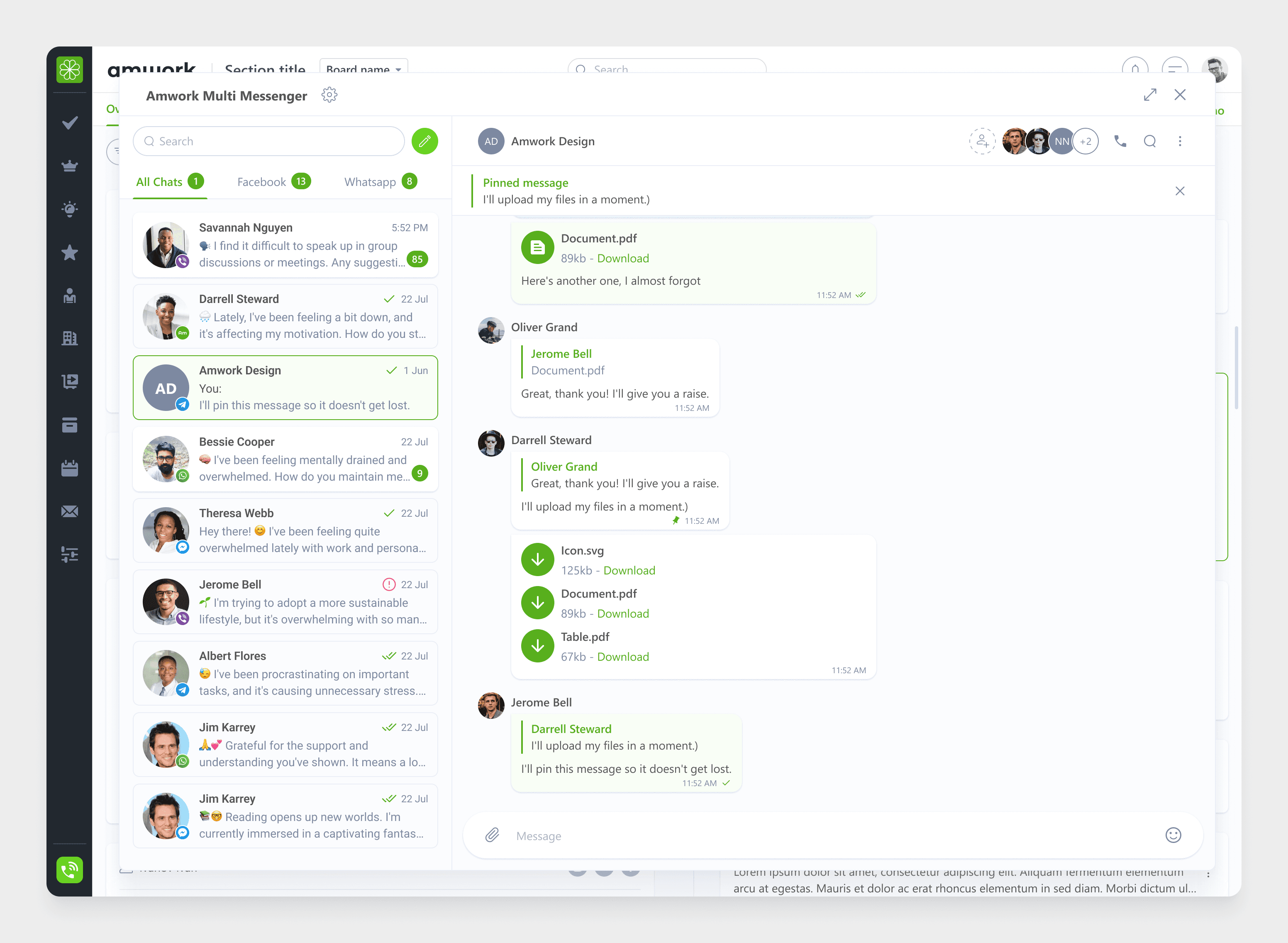 We also added a simple real‑time messenger: conversations tied to projects and tasks, mentions and notifications, support for multiple communication channels through a multi‑messenger approach.