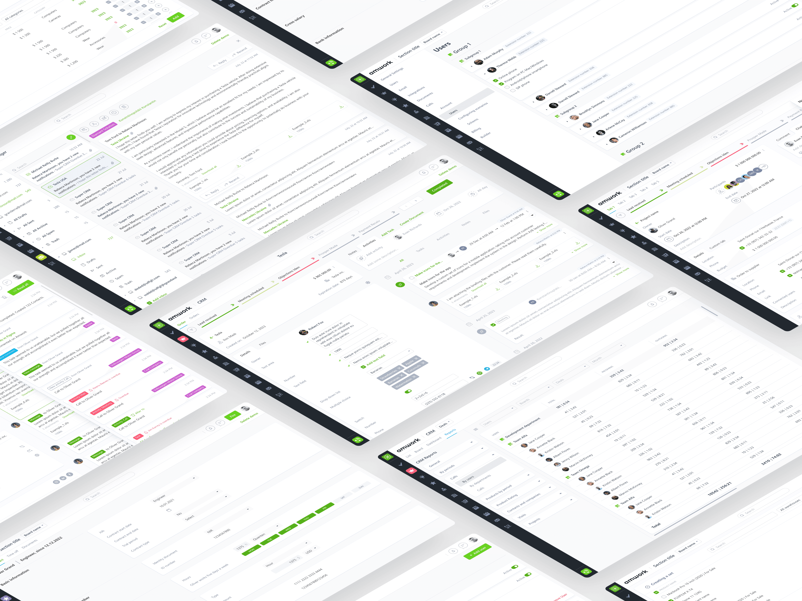 AmWork is a multi-module platform packed with features for managing business operations across teams and departments. Below are just a few examples from the broad set of tools I worked on:
